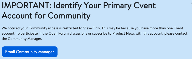 If you’re logged in to Community and see this message (see below), you may have accessed the Community under a secondary account. Please login to your primary account and try again or use the "Email Community Manager” for help in reassigning your primary account.