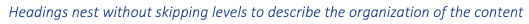 Headings have different levels, which you can use to nest content into a hierarchy. Think of it like a table of contents of the page. Each page of your website is like its own book or document with a title, section names, and maybe sub-sections, or sub-sub-sections! Sub-sub-sections get confusing, which is why we use numbers to identify heading levels.