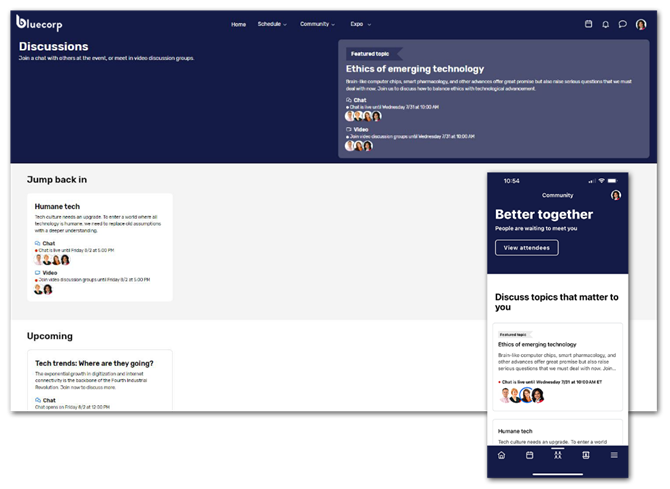 - Use the Discussions feature: Discussions allow attendees to meet with up to five other people at a time, either through a video meeting, or through chat. As a planner, you can set the topic, description, and can specify how long each conversation will last. You can have speakers host these Discussions on different topics they covered in their sessions, and attendees can join them to continue the conversation, or ask any follow-up questions they may have. You can assign the speakers as moderators, so they have control over the discussion. If there are certain groups you do not want to have access to the Discussions, you can limit the visibility of the Discussions feature to certain attendee groups as well.