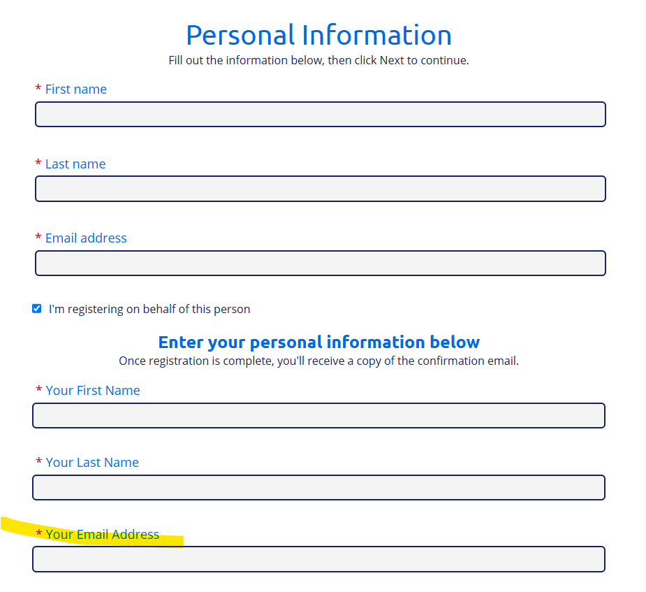 If they checked off the box for "i am registering on behalf of this person" and entered in their email address as the administrator email address in the section highlighted below and not the attendee email address section above it, then they will be able to register themselves for the event without issue. However, if they entered in their own email address for the attendee email address and are then trying to register for the event themselves with the same email address, then they will not be able to do so. Two people cannot be registered for the event with the same email address. If that is the case, I would recommend that the email address of the first person who was registered is swapped out to be their own vs. the other persons.