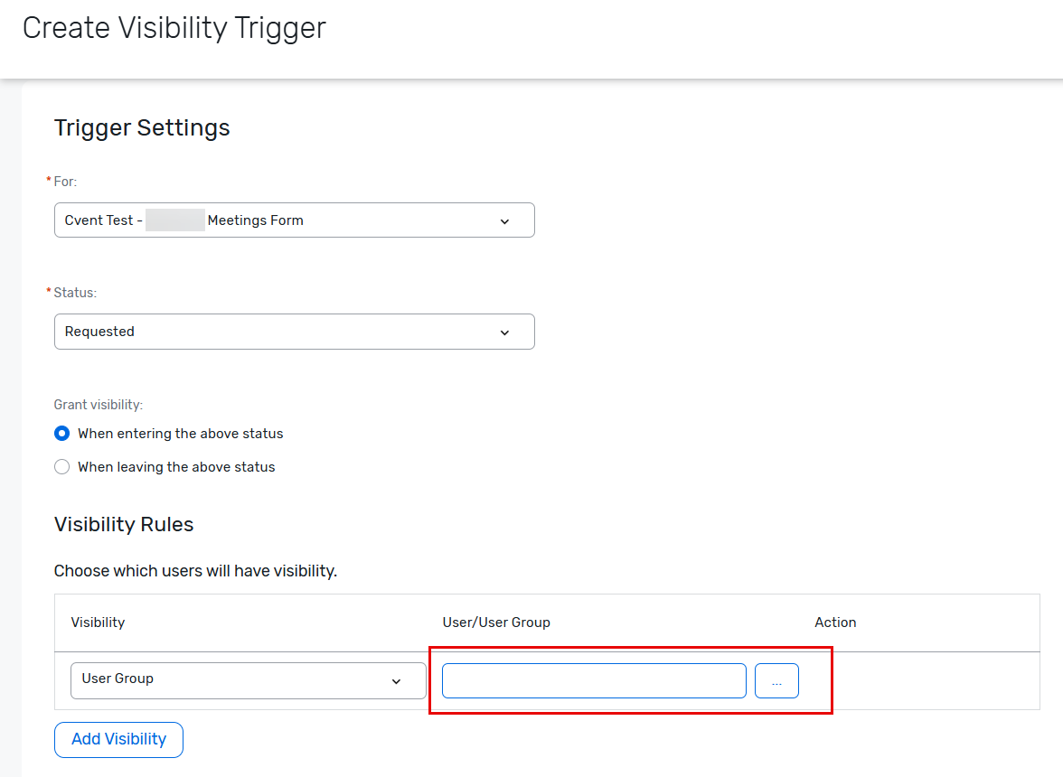 Next, you'll want to select the Form and the Status that will trigger the action and select the User Group that you want to grant visibility to: