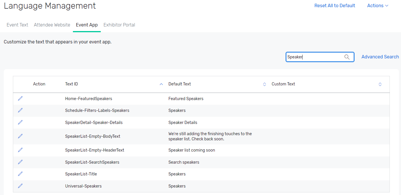 You can! You'll need to go to Language Management under the Marketing tab in the panel. Once there, make sure you switch to "Event App" to see those options. I searched for 'Speaker' and there are multiple fields where you can change the language: