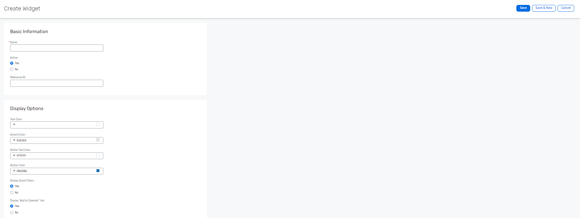 2. Give it a name > Active : Yes > Add a reference ID (it can be same as name) > Select the display options > 'Display Event Filters' : Yes > 'Display "Add to Calendar" link' : Yes > Save.