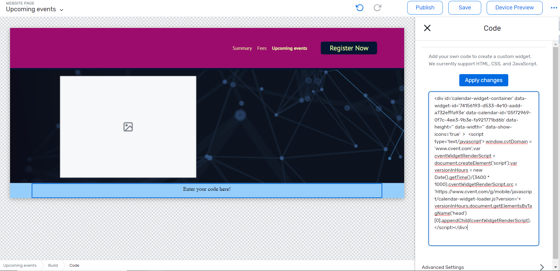 7. Remove the existing code from the widget box on the right and paste the calendar code you created earlier > Click on Apply changes > publish.