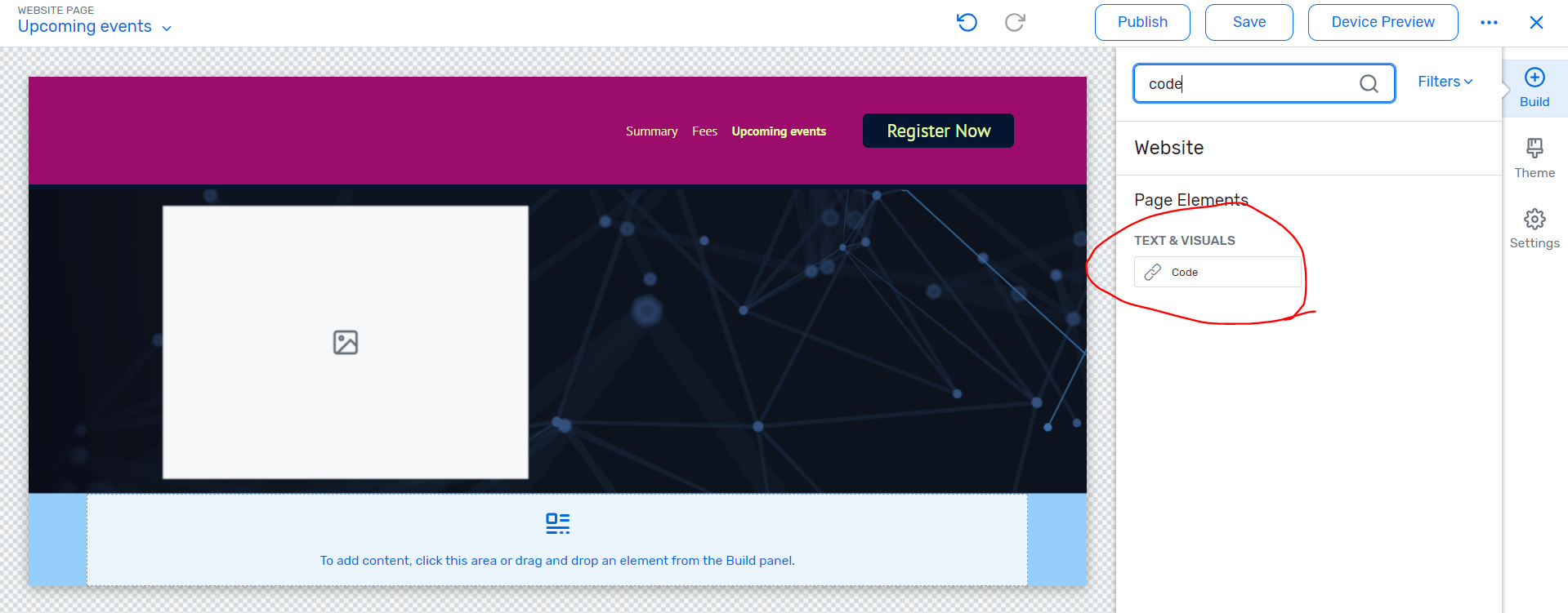6. Click on 'Build' on the right and drag and drop the 'Code' widget on the canvas.