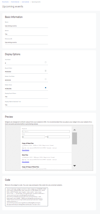 1. Please go to your account > Event calendar > click on the calendar you want to display > click on the last tab that says 'Web Widget' > click on 'Create web widget.
