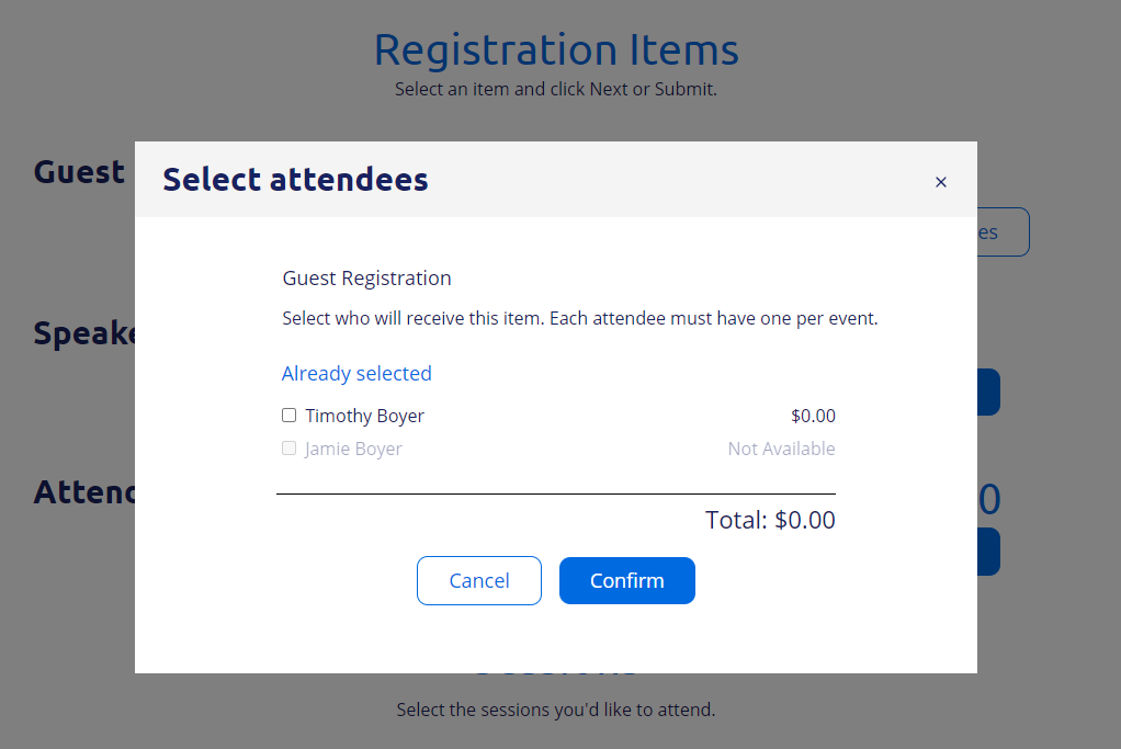 I have multiple registration types in my event. I am trying to add a guest registration option to 2 of my specific registration types. I don't want the guest option to charge a fee. I am clearly missing something...The guest registration shows up on the path but when they enter a guest it will not allow the user to select the "Guest Registration Fee" option. It is automatically forcing them to be added as a paid attendee. the Attendee registration should not even be showing up here. When I try to select the Guest Registration attendee, Jamie in this case is not an option for me. HELP. What am I missing. I have been trying to troubleshoot this for days!
