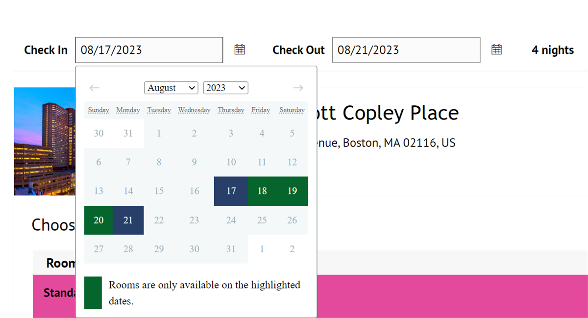In this event I have the housing block created to start on 8/17 - 21 with rooms listed in each room night. When I test the site and click on the calendar pop up the note at the bottom indicate that those dates shaded in green are the nights available. In this case, 8/17 is shaded in blue, not green, making it seem like it's not available. You can still select it and continue but the calendar pop up is confusing. Is there a fix to this so the attendees don't think that night isn't available?