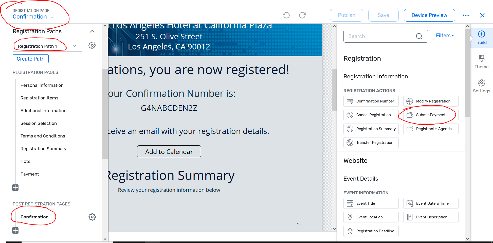 Please go to your Event > Registration > Registration process > Open Site Designer > Click on the arrow at top left and scroll down to Registration paths > Click on the 'Confirmation' Page under 'Post registration pages > On the right, within the Build Menu, you'll see the 'Submit Payment' widget. Drag and drop that widget on the canvas ( I would recommend adding it below 'Add to Calendar' widget > Do this for the confirmation pages under all the paths > Publish.