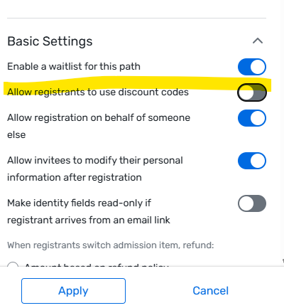 I have put together a simple registration site to collect a $25 fee, but can't figure out how to get rid of the discount code box and the apply button on the payment page. Can anyone advise? Thanks.