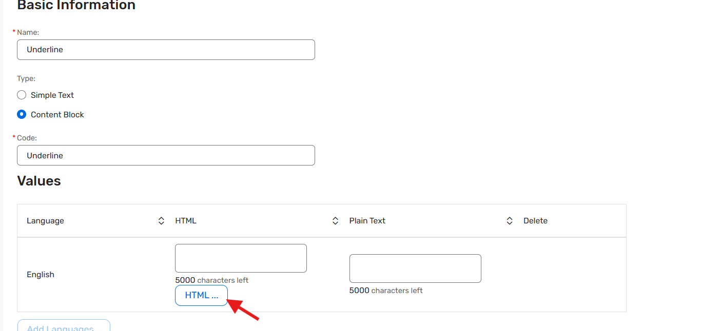 To do this, go to Admin > General > Custom Data Tags > Create Data Tag, select the type as Content Block, and click HTML.