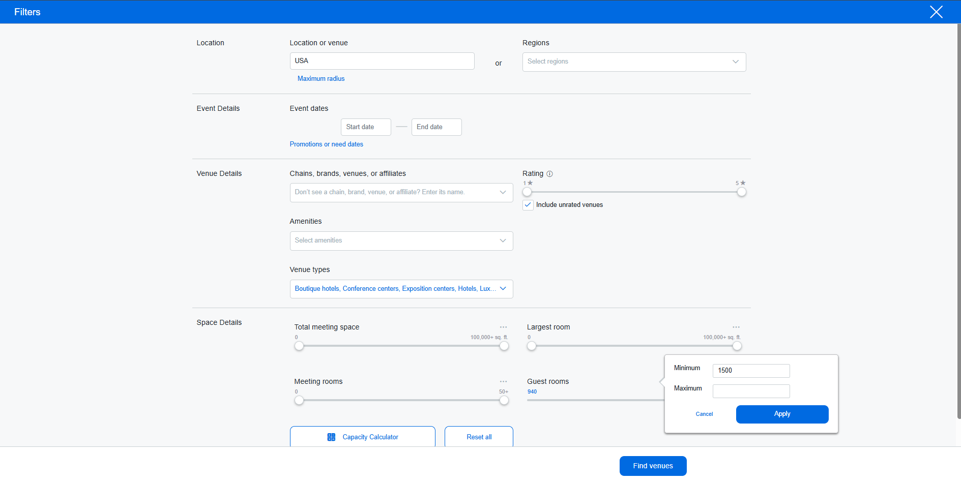 Looking for an easy way to get a listing across the USA not the individual regions of large scale hotels with 1500 rooms in an easy to use report. Can anyone guide me?