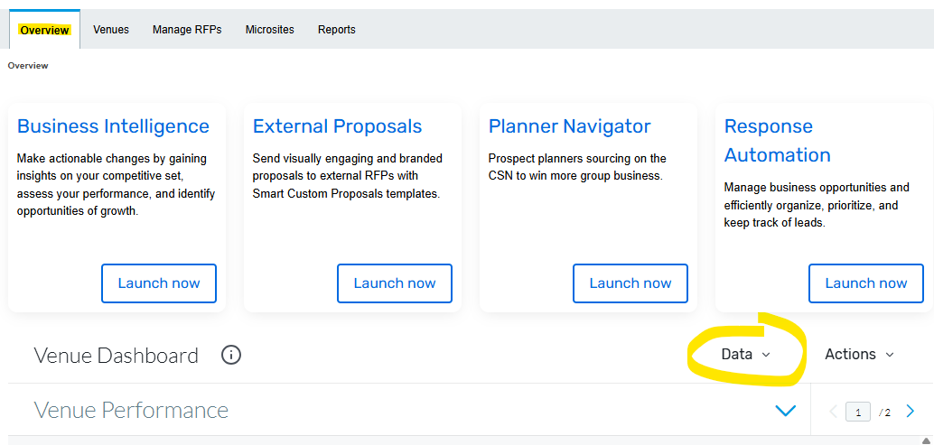 If you have Business Intelligence's Enterprise Dashboard, you can use the Competitive Set Comparison. If you do not have this subscription, then I suggest the Venue Dashboard, which is located on the Overview tab. You can adjust the venue selected by clicking on the Data dropdown and editing the Selection Criteria.