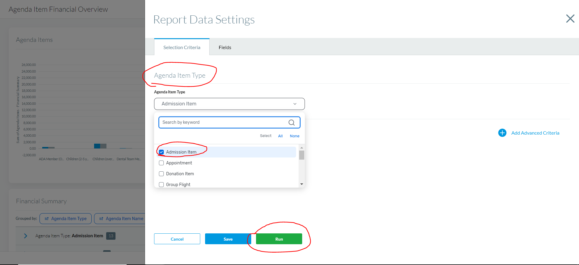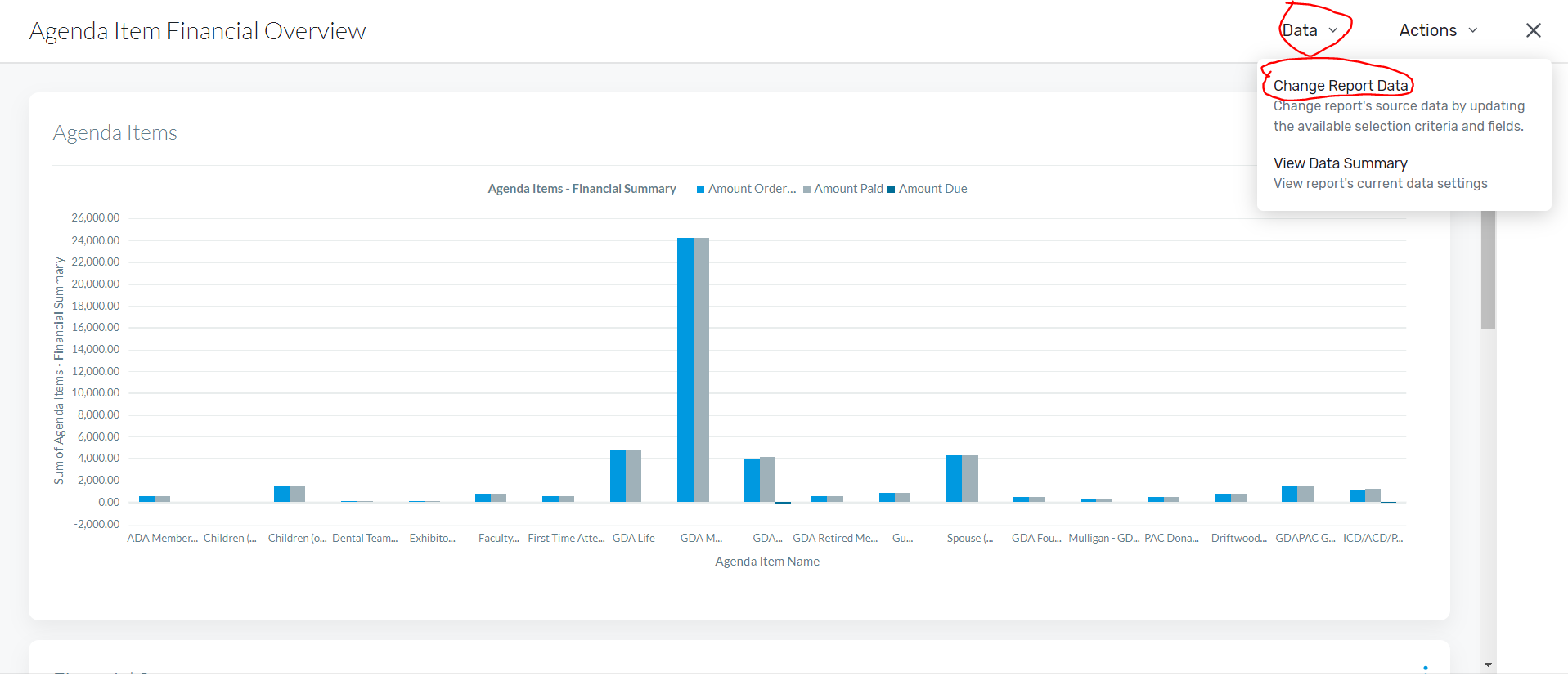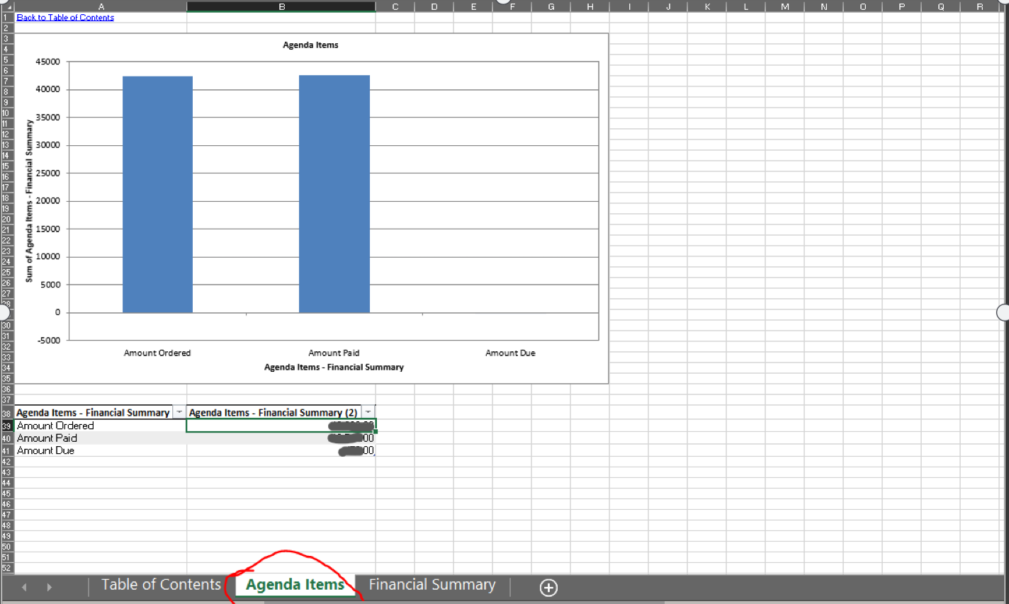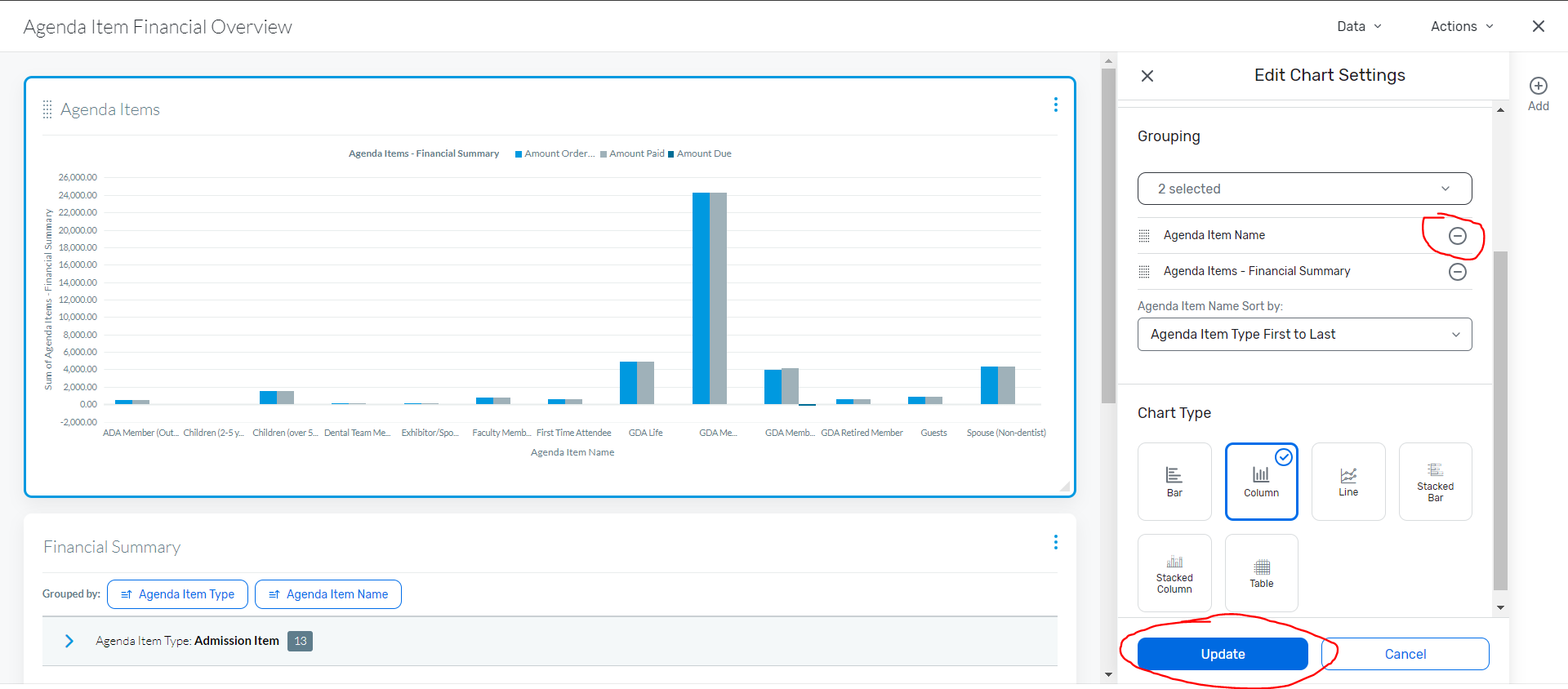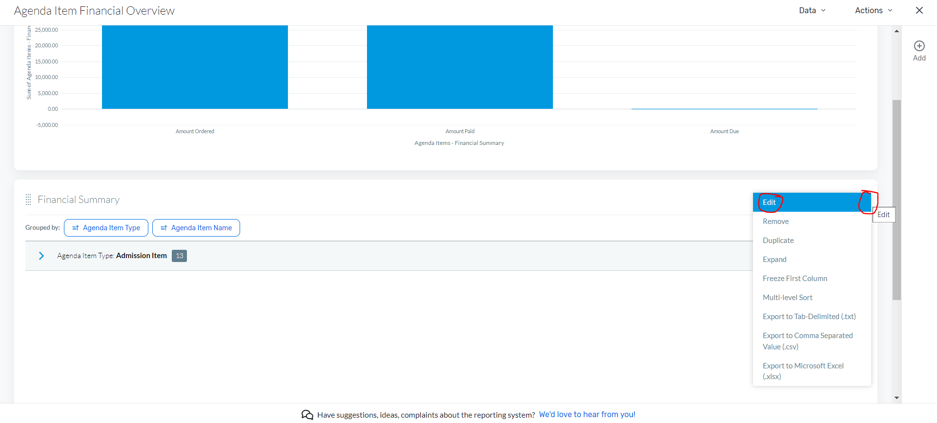 For the graphical representation, click on the ellipses infront of 'Agenda Item' and click on Edit > Under 'Grouping', remove 'Agenda Item Name' > Update > Scroll down to 'Financial Summary' and edit the section the same way and under Groupings tab, only keep 'Agenda Item Type' option > Update > At top right, click on Actions > Export the report in excel format.
