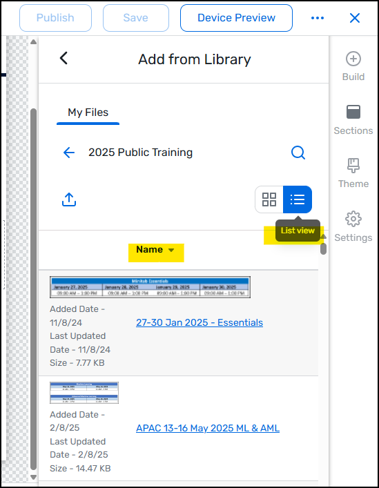 I went to upload a new image in site designer today and noticed the new interface. I'm fine with that, it looks great. When I go to find my added image from the Library, I normally use list view and then sort by most recently added so I can grab the image quickly and easily. You can sort that way in grid view but list view only has the Name option as shown below. We have a lot of images we add in here so it is difficult that this is only sorting option. Are others seeing this? Any ideas of a plan to add the rest of the sorting options for list view? Maybe I missed something on it but I couldn't fin information about this after searching the community. Thanks!