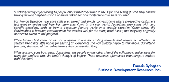 With the Cvent Reference Program, you're not signing up for back-to-back commitments or rigid schedules. You set the pace. You choose when you engage. You decide how often you show up.