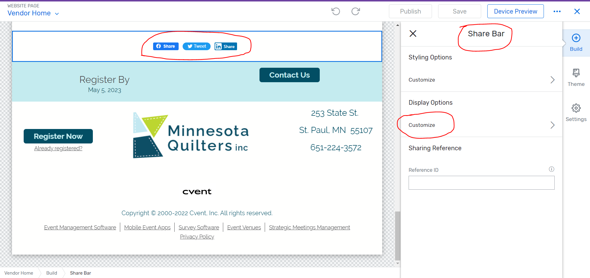 Please go to your event > Website > open site designer > Click on the 'Share Bar' widget > a panel will open on the right > Click on Customize under 'Display Options' > Scroll down to '