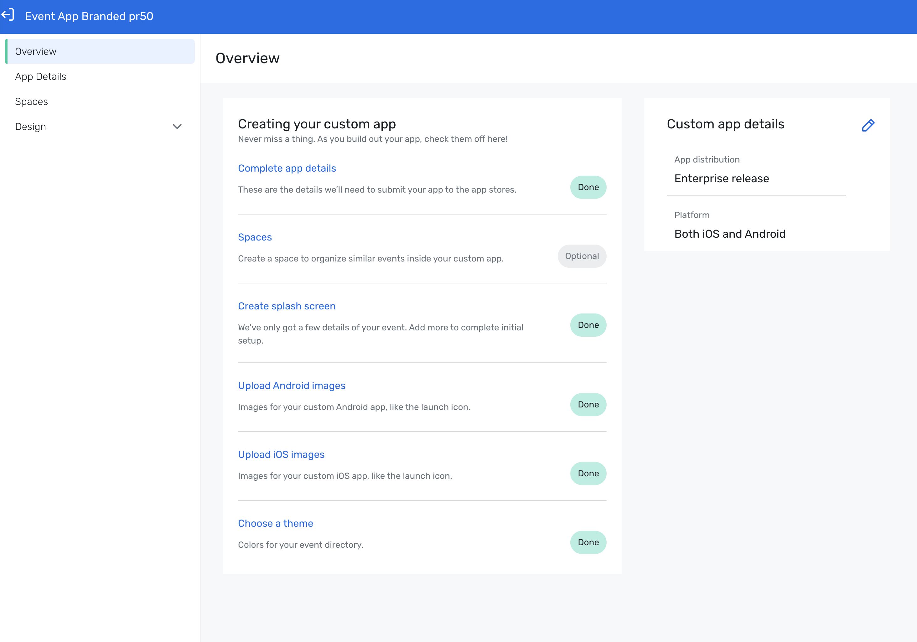 If you are building a branded custom app, you can add app information and manage branding within Cvent creating a self-service builder experience.