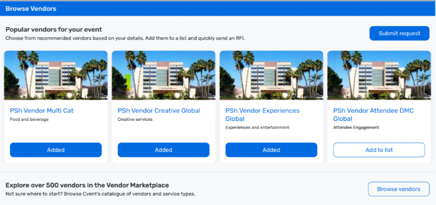 You will now see a set of 4 recommended vendors on the RFP award success screen when awarding a Venue RFP. With this, you can send a Vendor RFI to these vendors within 2 clicks. You can also click the "Browse Vendors" option to start fresh on Vendor Marketplace and browse the vendor inventory.