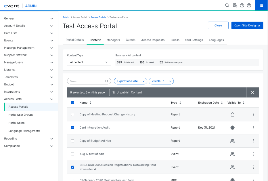 The Access Portal Content tab has been redesigned with an enhanced table. Portal managers can now easily search, sort, and filter the list of published content. Also, the table is paginated and there is an option to select the desired number of contents per page.