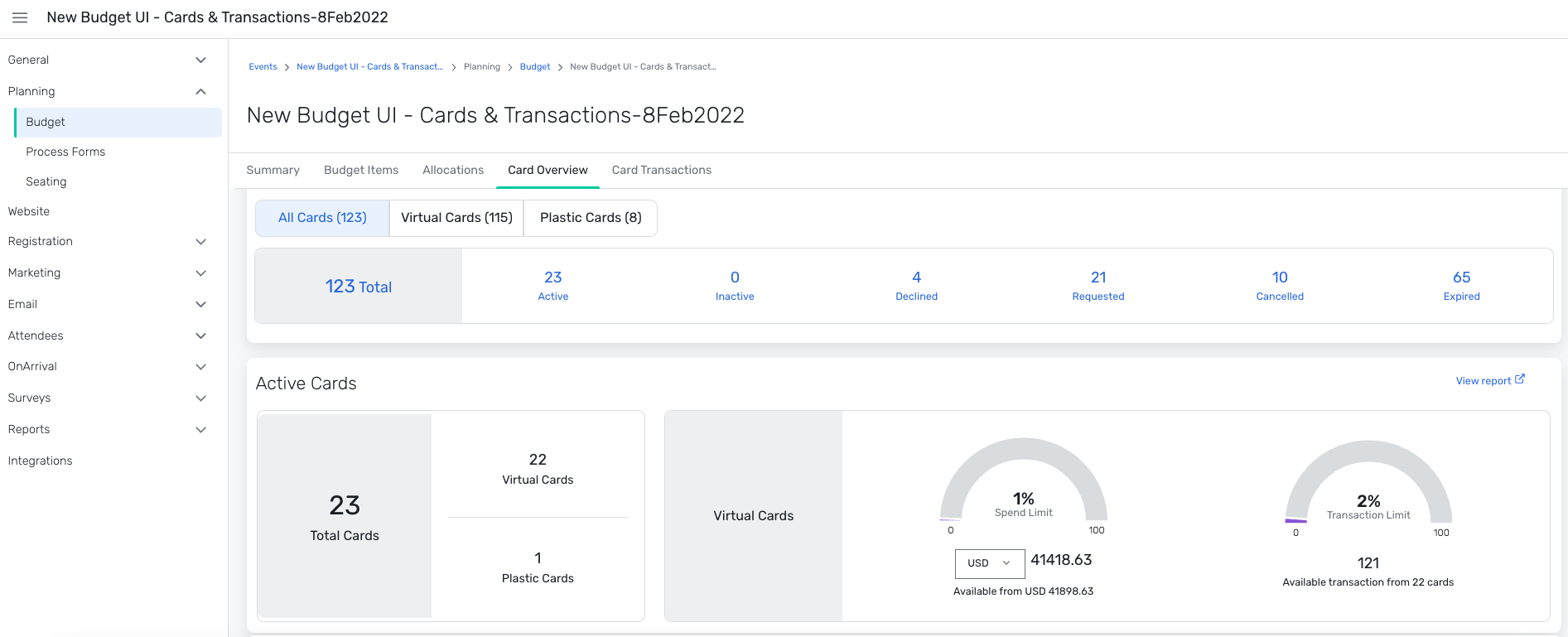 You can now access all the metrics in regard to Card Integrations in New Budget on the separate Card Overview page. This dashboard was built to provide actionable insights to you regarding event's funding and reconciliation of the event expenses.