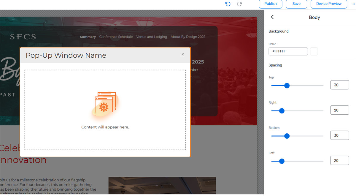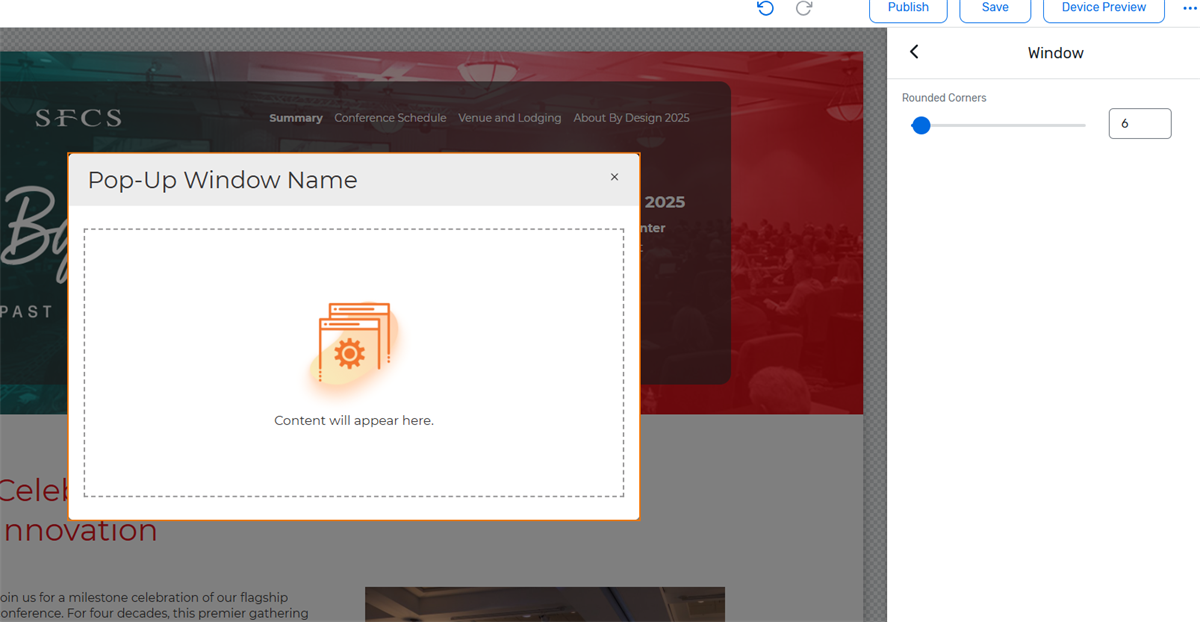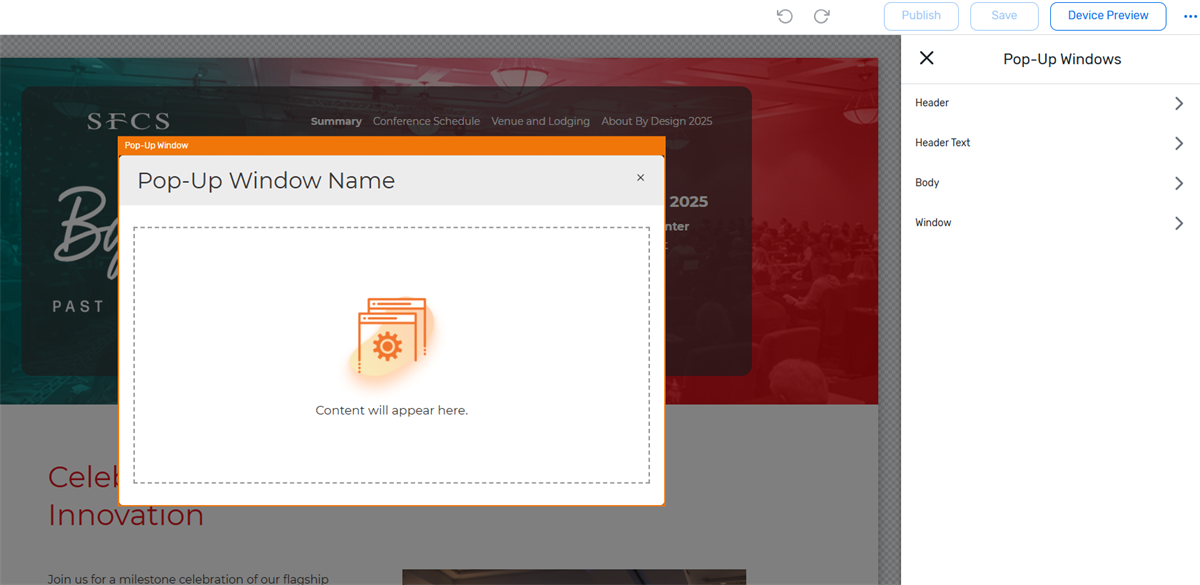 Open the site designer click on Theme (right navigation) > Theme Styling section > Pop-Up Windows. From there you can edit the Header, Header Text, Body, and Window colors.