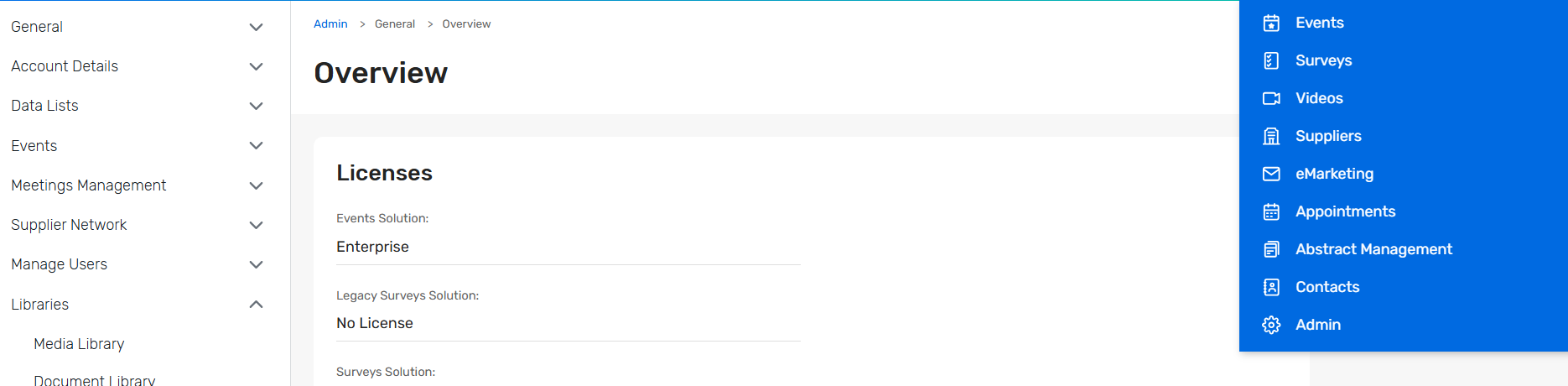 To access the Media Library, navigate to Admin from the top-right app switcher, then go to Libraries > Media Library.