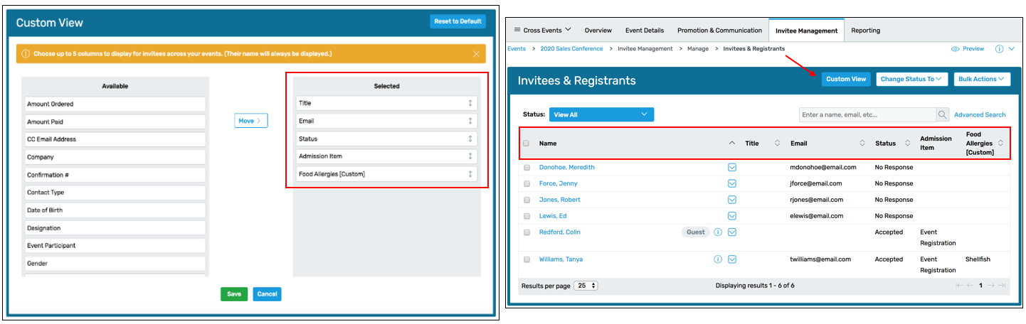 Custom View for Invitees & Registrants Page: You can now customize the Invitees & Registrants page to show the information you want to see in both Classic and Flex events! You can choose up to five columns, and this view will only apply to you (other users can choose their own columns). If you ever want to go back to the original view, you can always click the "Reset to Default" button in the top right corner.